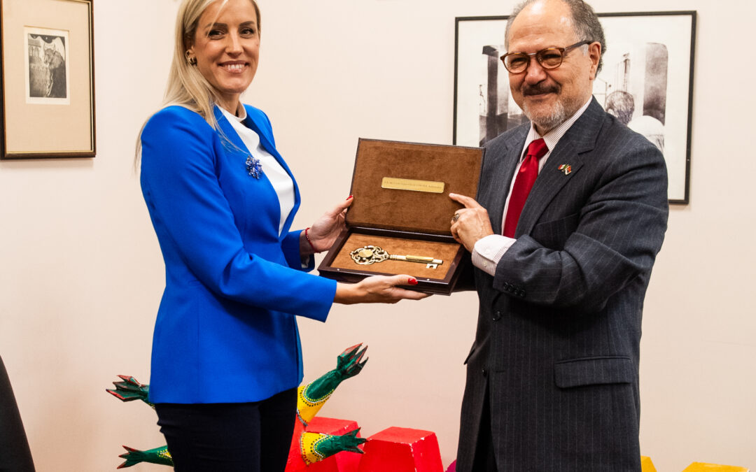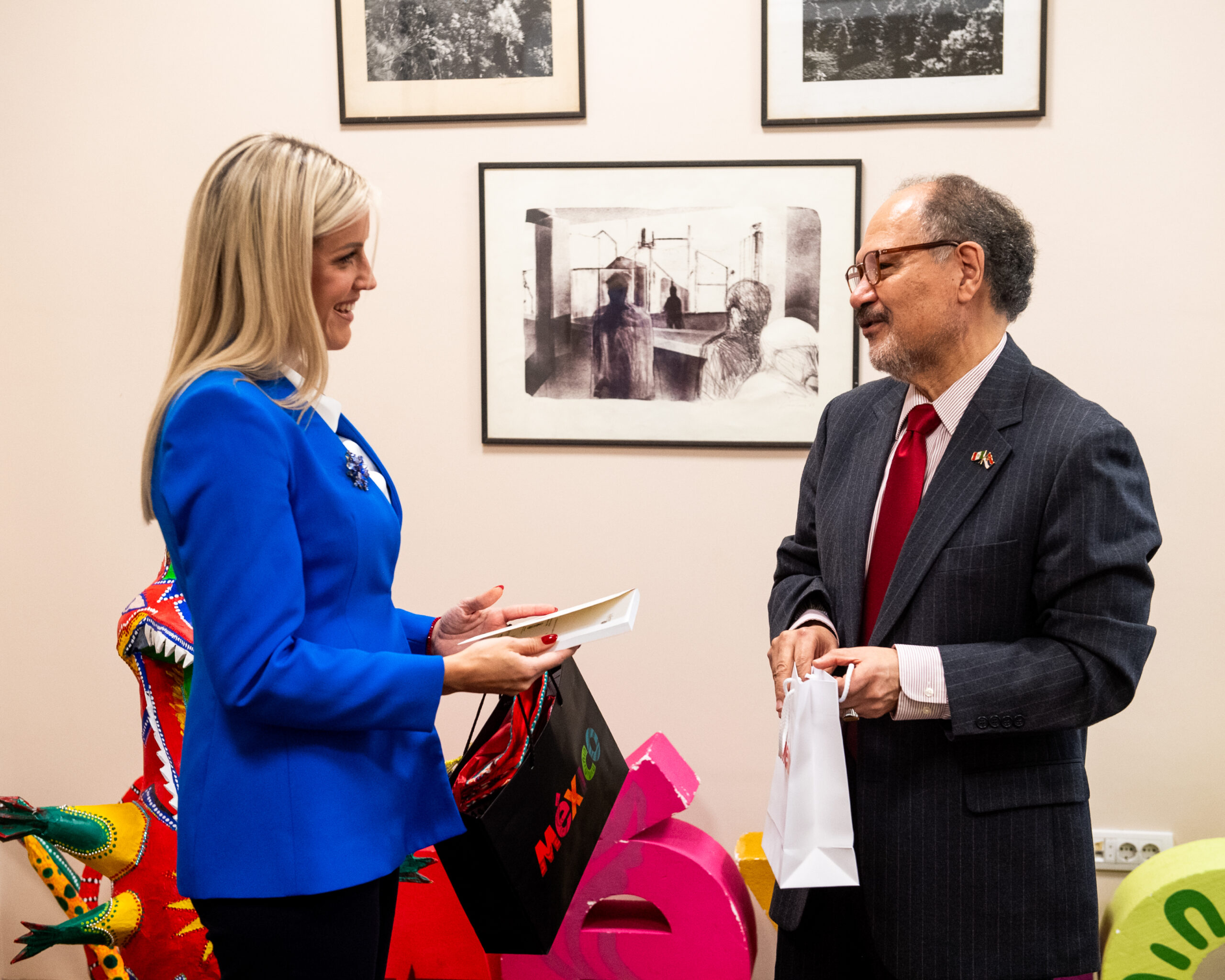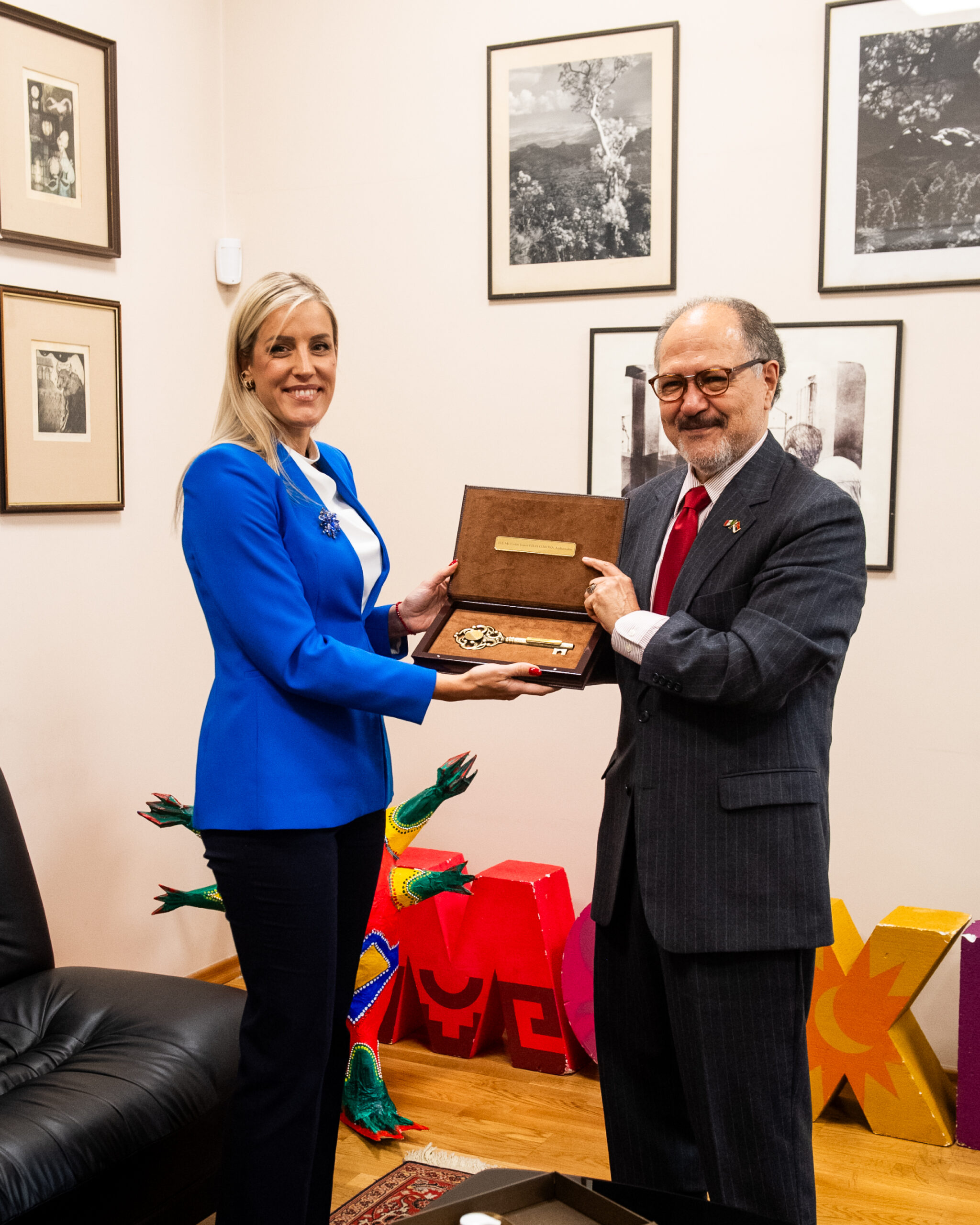 Први Уговор о закупу Амбасаде Мексика и нашег Друштва потписан је 1956. године, а Амбасада се већ деценијама налази у објекту из нашег портфолија, у улици Љутице Богдана 5, због чега је данашња посета имала посебно свечан и емотиван карактер. Изражавајући захвалност на вишедеценијском поверењу и сарадњи, директорка Мартиновић уручила је Његовој Екселенцији специјални „Кључ поверења“ — симболичан знак поштовања, лојалности и узајамне посвећености, а током разговора обе стране истакле су велико задовољство изграђеним партнерством.